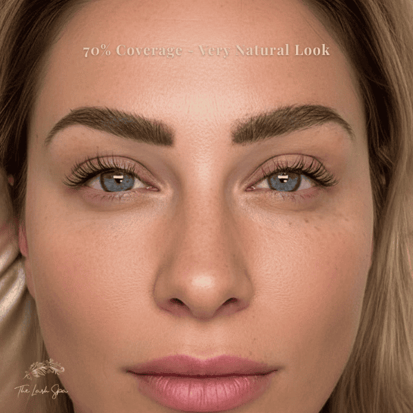 Our Classic Natural is our lightest and most subtle lash set, designed to closely mimic your natural lashes with approximately 70% coverage. It gently enhances length, with fullness determined by your natural lash density.